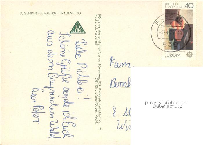 73651791 alte Postkarte Frauenberg Bayrischer Wald Jugendherberge postalisch gelaufen Erhaltung siehe scans [WerneD78] KatCode: 11110009272120