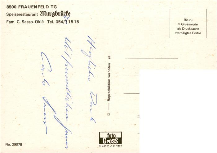 13897037 Frauenfeld TG Speiserestaurant Murgbruecke Gastraeume postalisch nicht gelaufen Erhaltung siehe scans [FriedD77] KatCode: 11470200615064