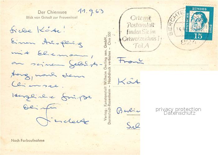 73019354 alte Postkarte Fraueninsel Chiemsee Blick vom Gstadt Dampfer postalisch gelaufen Erhaltung siehe scans [NatalD47] KatCode: 11110009187123