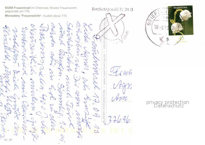 72890220 alte Postkarte Fraueninsel Chiemsee Fliegeraufnahme Kloster Frauenwoerth postalisch gelaufen Erhaltung siehe scans [AndreD76] KatCode: 11110009187123