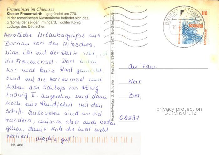 72448623 alte Postkarte Fraueninsel Chiemsee Kloster Frauenwoerth postalisch gelaufen Erhaltung siehe scans KatCode: 11110009187123