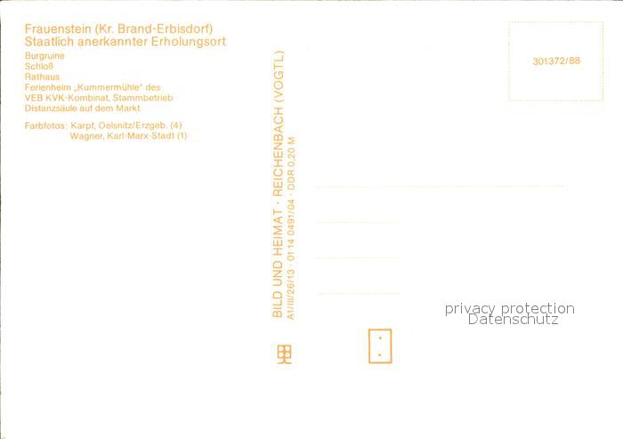 72373577 Frauenstein Brand-Erbisdorf Burgruine Schloss Rathaus Ferienheim Kummermuehle Distanzsaeule postalisch nicht gelaufen Erhaltung siehe scans KatCode: 11110014177030