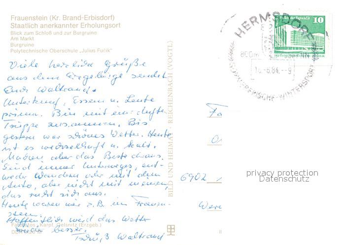 73062316 alte Postkarte Frauenstein Brand-Erbisdorf Schloss Burgruine Markt Polytechnische Oberschule Julius Fucik postalisch gelaufen Erhaltung siehe scans [FriedD77] KatCode: 11110014177030