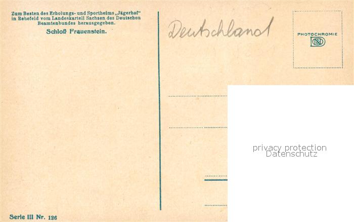 43349934 Frauenstein Sachsen Schloss Erinnerungskarte Sportheim Jaegerhof Photochromie Serie III Nr. 126 postalisch nicht gelaufen Erhaltung siehe scans [FriedD77] KatCode: 11110014177140