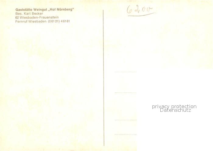 73086698 Frauenstein Wiesbaden Gaststaette Weingut Hof Nuernberg postalisch nicht gelaufen Erhaltung siehe scans [NatalD47] KatCode: 11110006414000