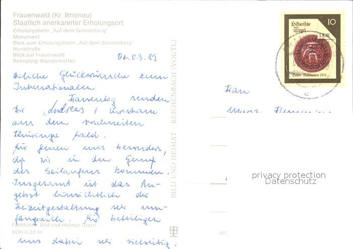 72373084 alte Postkarte Frauenwald Thueringen Erholungsheim Sonnenberg Monument Nordstrasse Rennsteig Wanderhuetten postalisch gelaufen Erhaltung siehe scans KatCode: 11110016070015