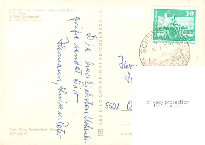 73842180 alte Postkarte Frauenwald Thueringen FDGB Erholungsheim Raymonde Dien Milchbar Cafe Lenkgrund Platz des Friedens postalisch gelaufen Erhaltung siehe scans [WerneD78] KatCode: 11110016070015