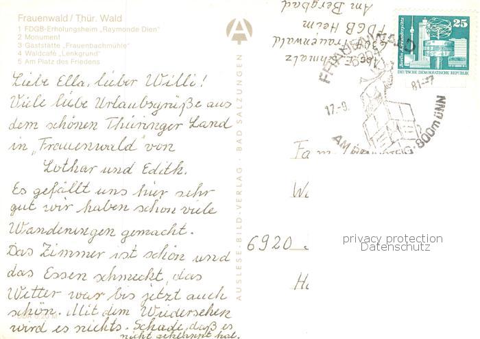 73766926 alte Postkarte Frauenwald Thueringen FDGB Erholungsheim Raymonde Dien Monument Gaststaette Frauenbachmuehle Waldcafe Lenkgrund Platz des Friedens postalisch gelaufen Erhaltung siehe scans [FriedD77] KatCode: 11110016070015