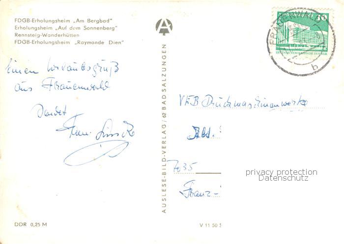73753886 alte Postkarte Frauenwald Thueringen FDGB Erholungsheime Am Bergbad Auf dem Sonnenberg Rennsteig Wanderhuetten FDGB Erholungsheim Raymonde Dien postalisch gelaufen Erhaltung siehe scans [FriedD77] KatCode: 11110016070015