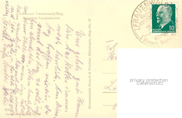 73083494 alte Postkarte Frauenwald Thueringen Gaststaette Fraubachmuehle postalisch gelaufen Erhaltung siehe scans [FriedD77] KatCode: 11110016070015