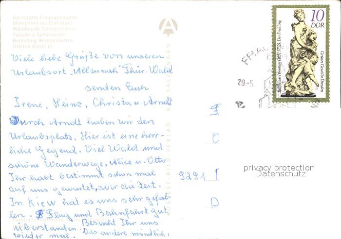 72324007 alte Postkarte Frauenwald Thueringen Gaststaette Fraubachmuehle Monument am Bohrstuhl Waldbaude Dreiherrnstein Talsperre Schoenbrunn Ortsteil Allzunah postalisch gelaufen Erhaltung siehe scans KatCode: 11110016070015