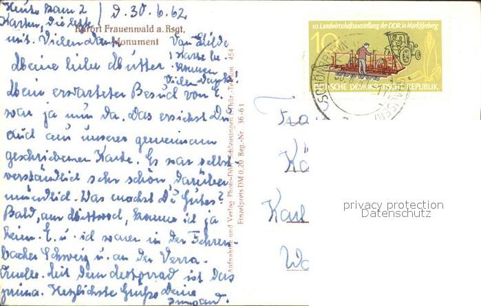 72405215 alte Postkarte Frauenwald Thueringen Monument postalisch gelaufen Erhaltung siehe scans KatCode: 11110016070015