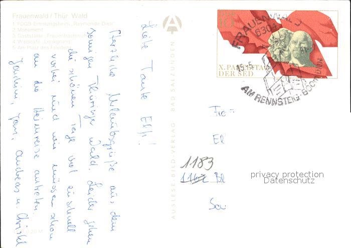 72263620 alte Postkarte Frauenwald Thueringen Monument Erholungsheim Raymon Dien Restaurant Frauenbachmuehle WaldCafe Lenkgrund postalisch gelaufen Erhaltung siehe scans KatCode: 11110016070015