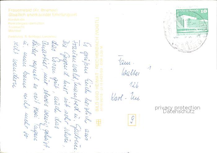 72373095 alte Postkarte Frauenwald Thueringen Nordstrasse Rennsteig Wanderhuetten Teilansicht Milchbar postalisch gelaufen Erhaltung siehe scans KatCode: 11110016070015