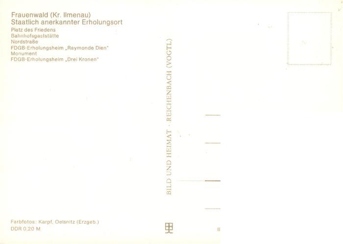 73876251 Frauenwald Thueringen Platz des Friedens Bahnhofsgaststaette Nordstrasse FDGB Erholungsheim Raymonde Dien Monument FDGB Erholungsheim Drei Kronen postalisch nicht gelaufen Erhaltung siehe scans [WerneD78] KatCode: 11110016070015