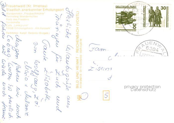 73152459 alte Postkarte Frauenwald Thueringen Waldpension Fraubachmuehle Rennsteg Wanderhuetten Platz des Friedens Nordstrasse Cafe Lenkgrund FDGB Erholungsheim postalisch gelaufen Erhaltung siehe scans [FriedD77] KatCode: 11110016070015
