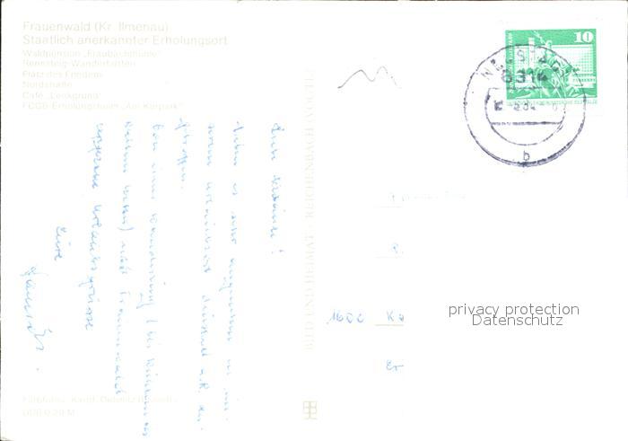72373085 alte Postkarte Frauenwald Thueringen Waldpension Fraubachmuehle Rennsteig Wanderhuetten Platz des Friedens Nordstrasse Cafe FDGB Erholungsheim postalisch gelaufen Erhaltung siehe scans KatCode: 11110016070015