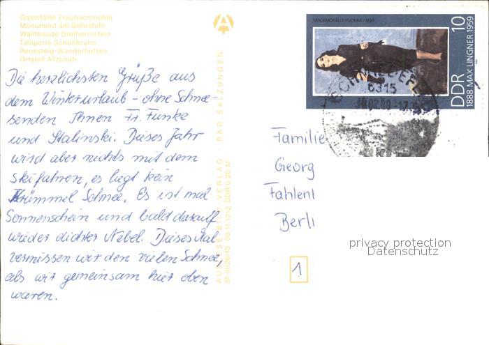 72261958 alte Postkarte Frauenwald Thueringen Wanderziele Gaststaette Monument Waldbaude Talsperre Schoenbrunn Rennsteig Wanderhuetten Allzunah postalisch gelaufen Erhaltung siehe scans KatCode: 11110016070015