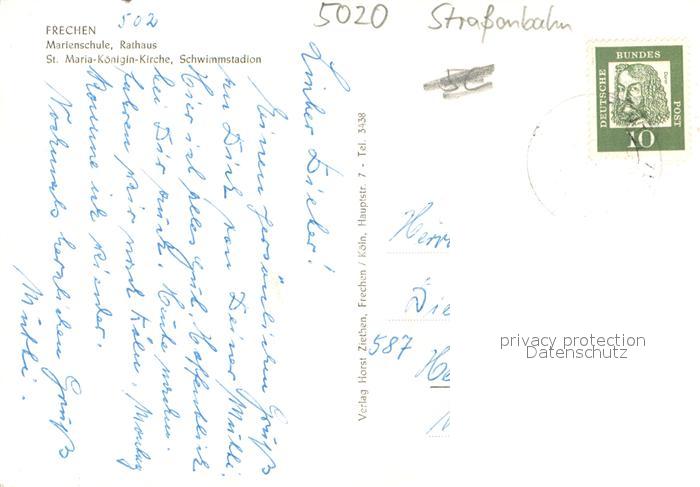 33703431 alte Postkarte Frechen Marienschule Rathaus St Maria Koenigin Kirche Schwimmstadion postalisch gelaufen Erhaltung siehe scans [WerneD78] KatCode: 11110005362024