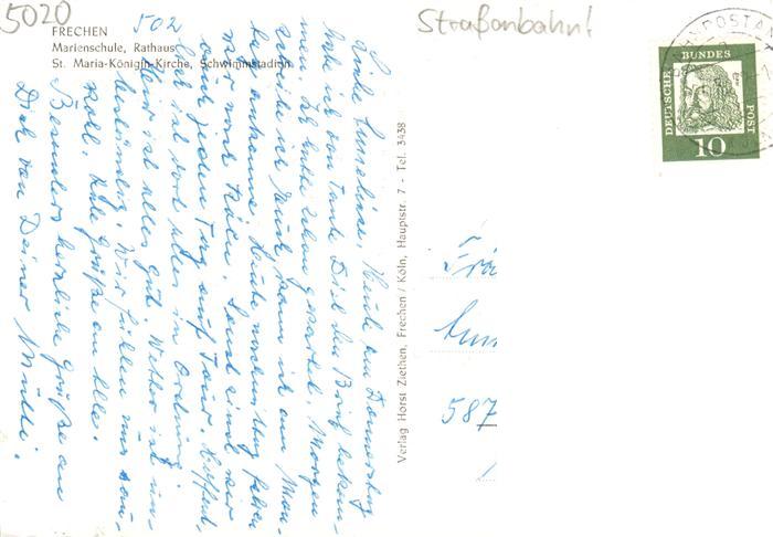 73872346 alte Postkarte Frechen Marienschule Rathaus St Maria Koenigin Kirche Schwimmstadion postalisch gelaufen Erhaltung siehe scans [WerneD78] KatCode: 11110005362024