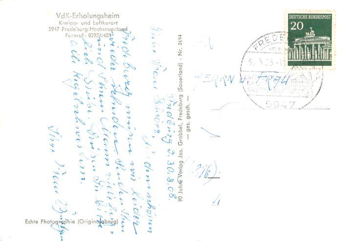 73924894 alte Postkarte Fredeburg Schmallenberg Fliegeraufnahme mit VdK Erholungsheim postalisch gelaufen Erhaltung siehe scans [WerneD78] KatCode: 11110005958040