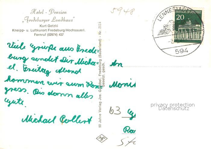 73710336 alte Postkarte Fredeburg Schmallenberg Hotel-Pension Fredeburger Landhaus Innen und Aussen postalisch gelaufen Erhaltung siehe scans [LiesaD40] KatCode: 11110005958040