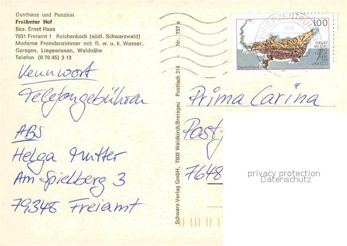 72707090 alte Postkarte Freiamt Gasthof Pension Freiaemter Hof postalisch gelaufen Erhaltung siehe scans [WerneD78] KatCode: 11110008316054