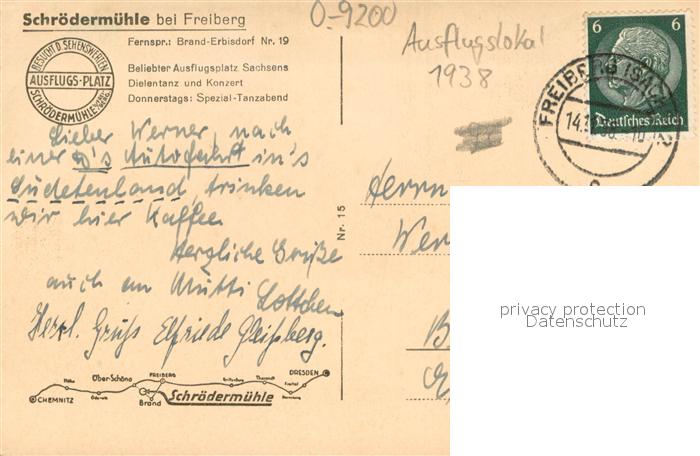 73708837 alte Postkarte Freiberg Sachsen Ausflugslokal Schroedermuehle Tanzdiele m. Spiegeldecke postalisch gelaufen Erhaltung siehe scans [LiesaD40] KatCode: 11110014177150