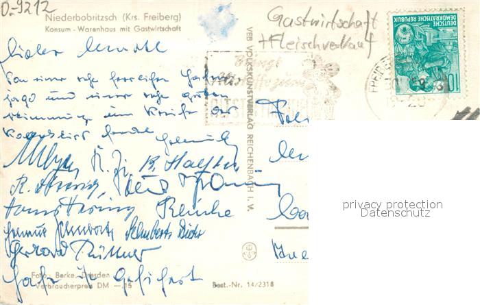 73708831 alte Postkarte Freiberg Sachsen Konsum-Warenhaus m. Gastwirtschaft u. Fleischverkauf Niederbobritzsch postalisch gelaufen Erhaltung siehe scans [LiesaD40] KatCode: 11110014177150