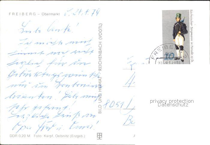 72401367 alte Postkarte Freiberg Sachsen Obermarkt mit Brunnen postalisch gelaufen Erhaltung siehe scans KatCode: 11110014177150
