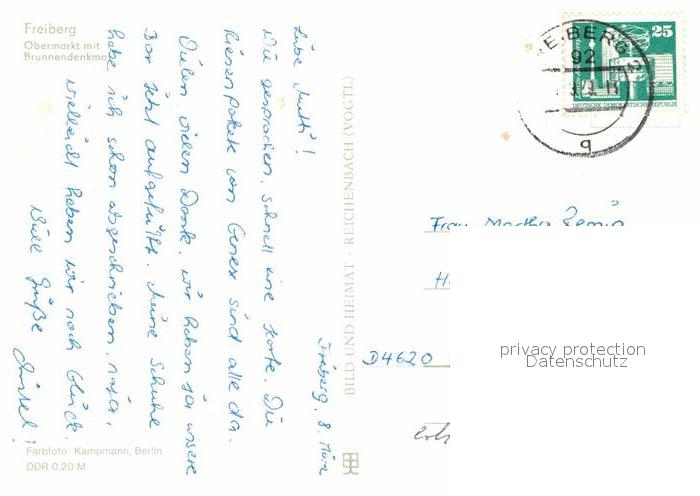 72715511 alte Postkarte Freiberg Sachsen Obermarkt mit Brunnendenkmal postalisch gelaufen Erhaltung siehe scans [FriedD77] KatCode: 11110014177150