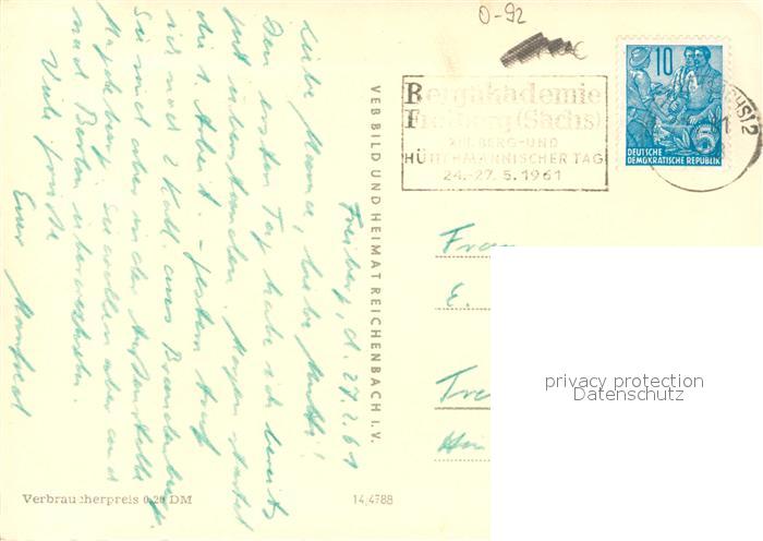 73044121 alte Postkarte Freiberg Sachsen Panorama Donatsturm Obermarkt Brunnendenkmal Schwanschloesschen Springbrunnen Scheringerpark postalisch gelaufen Erhaltung siehe scans [WerneD78] KatCode: 11110014177150