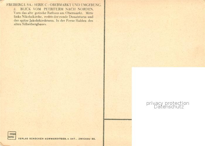 73084181 Freiberg Sachsen Rathaus Obermarkt Nikolaikirche Donatsturm Jakobikirchturm postalisch nicht gelaufen Erhaltung siehe scans [KathaD81] KatCode: 11110014177150