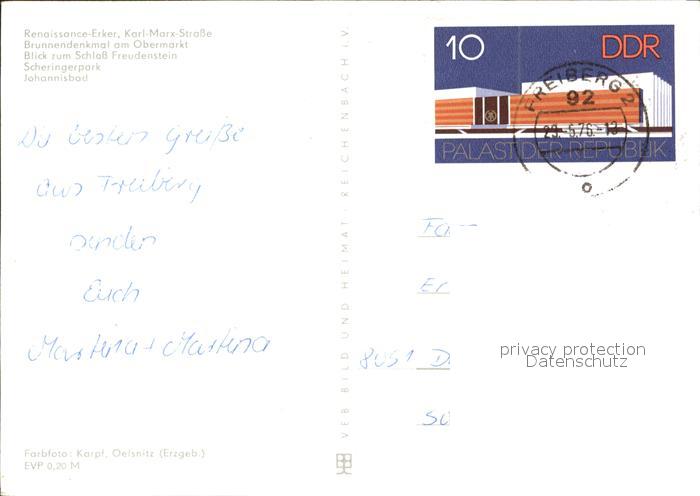 72374286 alte Postkarte Freiberg Sachsen Renaissance Erker Karl Marx Strasse Brunnendenkmal Obermarkt Schloss Freudenstein Scheringerpark Johannisbad postalisch gelaufen Erhaltung siehe scans KatCode: 11110014177150