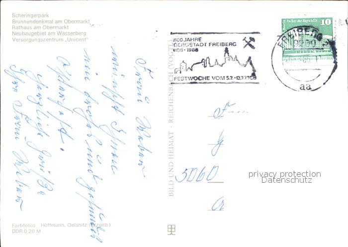 72557368 alte Postkarte Freiberg Sachsen Scheringerpark Brunnendenkmal Obermarkt Rathaus postalisch gelaufen Erhaltung siehe scans [KathaD79] KatCode: 11110014177150