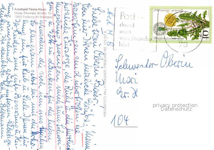 72663303 alte Postkarte Freiburg Breisgau Adelheid Testa Haus postalisch gelaufen Erhaltung siehe scans [AndreD76] KatCode: 11110008311000
