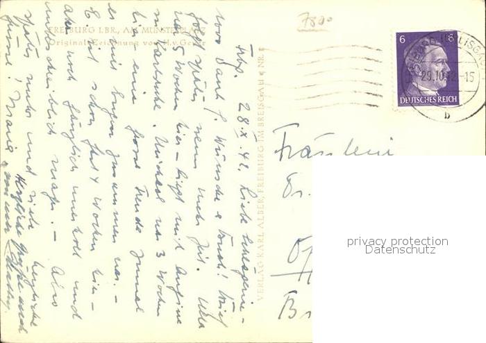 71913064 alte Postkarte Freiburg Breisgau Am Muensterplatz Zeichnung postalisch gelaufen Erhaltung siehe scans KatCode: 11110008311000