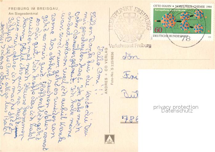 73336634 alte Postkarte Freiburg Breisgau Am Siegesdenkmal postalisch gelaufen Erhaltung siehe scans [WerneD78] KatCode: 11110008311000