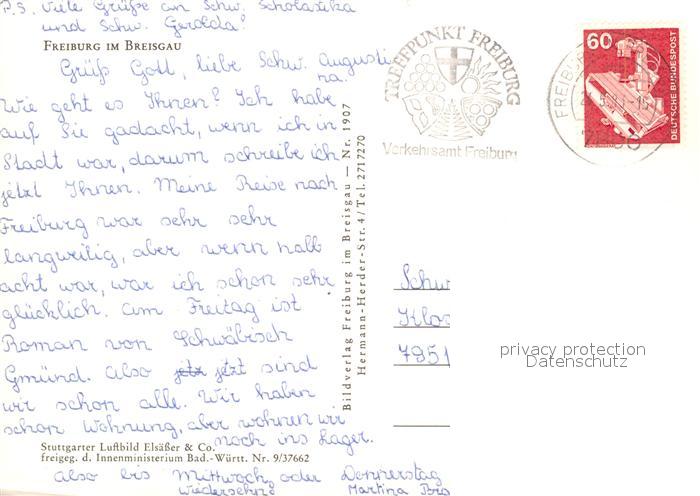 73168689 alte Postkarte Freiburg Breisgau Fliegeraufnahme Dreisam Muenster postalisch gelaufen Erhaltung siehe scans [KathaD81] KatCode: 11110008311000