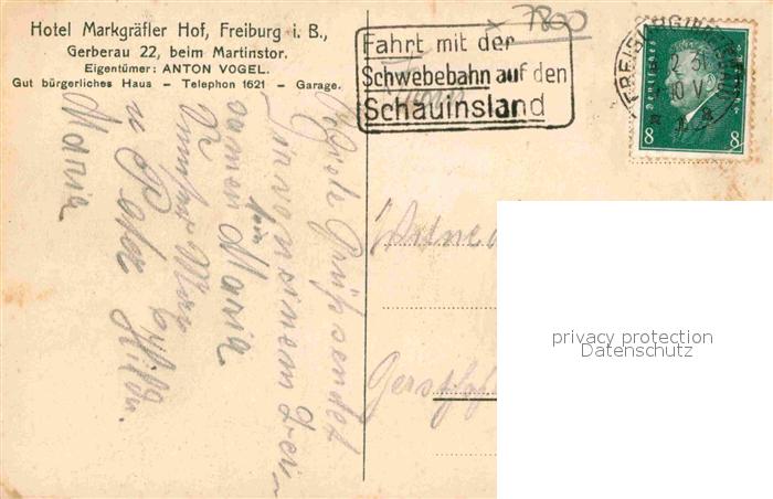 42688329 Freiburg Breisgau Hotel Markgraefler Hof Gerberau 22 postalisch gelaufen Erhaltung siehe scans [LiesaD40] alte Postkarte Lies Katcode 11110008311000