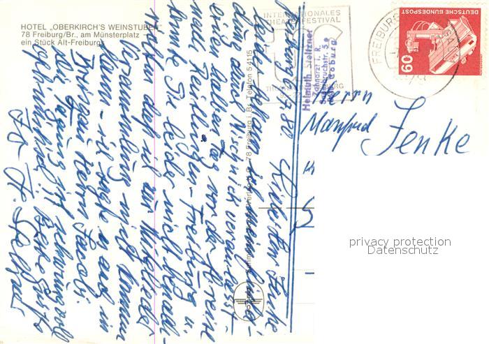 73724598 alte Postkarte Freiburg Breisgau Hotel Oberkirchs Weinstuben postalisch gelaufen Erhaltung siehe scans [FriedD77] KatCode: 11110008311000