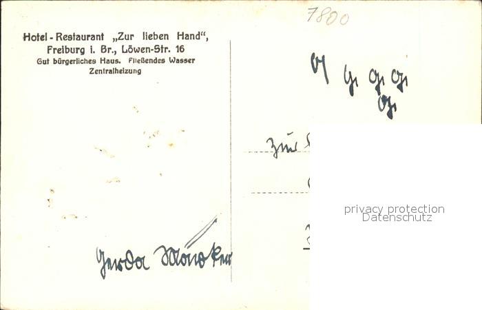 31821472 Freiburg Breisgau Hotel Restaurant Zur lieben Hand postalisch nicht gelaufen Erhaltung siehe scans KatCode: 11110008311000