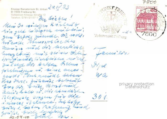 72910039 alte Postkarte Freiburg Breisgau Kneipp-Sanatorium St. Urban postalisch gelaufen Erhaltung siehe scans [LiesaD40] KatCode: 11110008311000