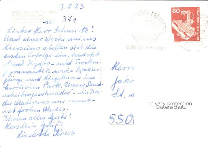 72229942 alte Postkarte Freiburg Breisgau Kneipp-Sanatorium St. Urban postalisch gelaufen Erhaltung siehe scans KatCode: 11110008311000