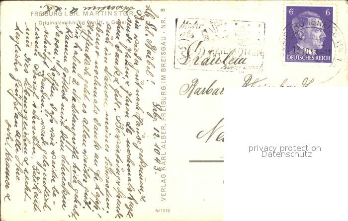 71838539 alte Postkarte Freiburg Breisgau Martinstor Kuenstlerkarte Originalzeichnung H. v. Geyer postalisch gelaufen Erhaltung siehe scans KatCode: 11110008311000