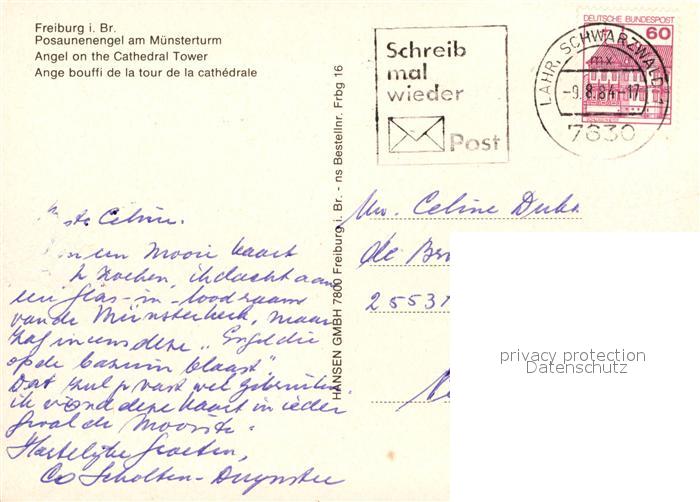 72942872 alte Postkarte Freiburg Breisgau Posaunenengel am Muensterturm postalisch gelaufen Erhaltung siehe scans [FriedD77] KatCode: 11110008311000