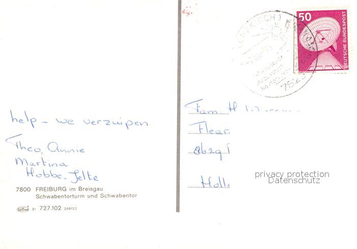 72942106 alte Postkarte Freiburg Breisgau Schwabentorturm Schwabentor postalisch gelaufen Erhaltung siehe scans [FriedD77] KatCode: 11110008311000