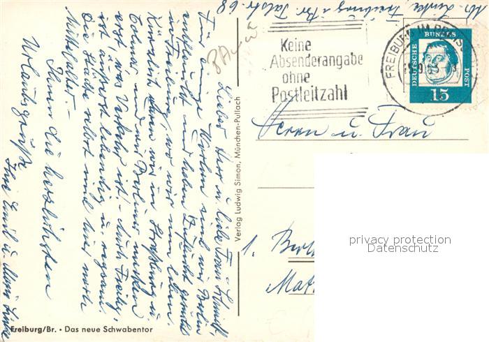 73131860 alte Postkarte Freiburg Breisgau Stadtbild mit neuem Schwabentor postalisch gelaufen Erhaltung siehe scans [FriedD77] KatCode: 11110008311000