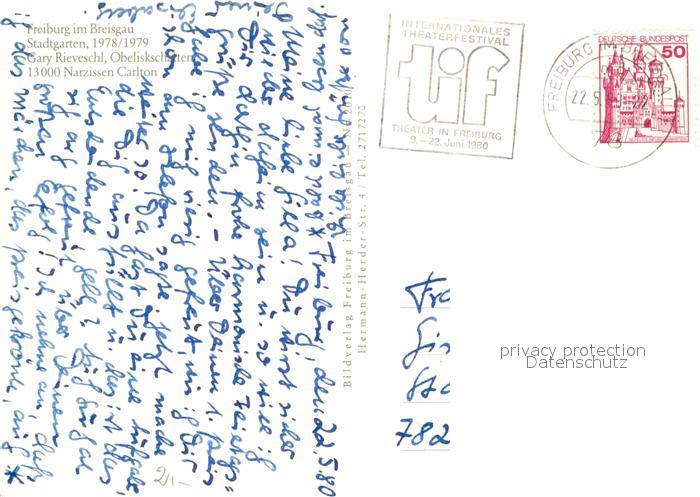 72854567 alte Postkarte Freiburg Breisgau Stadtgarten Gary Rieveschl Obeliskschatten postalisch gelaufen Erhaltung siehe scans [LiesaD40] KatCode: 11110008311000