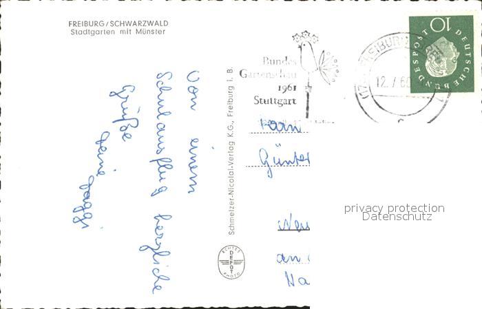 72082957 alte Postkarte Freiburg Breisgau Stadtgarten mit Muenster postalisch gelaufen Erhaltung siehe scans KatCode: 11110008311000